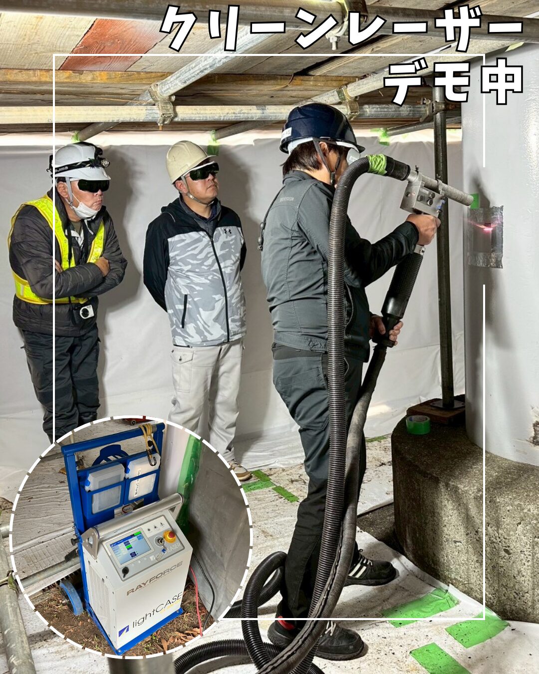 こちらは実際現場でクリーンレーザー工法のデモを行っている様子です🔥