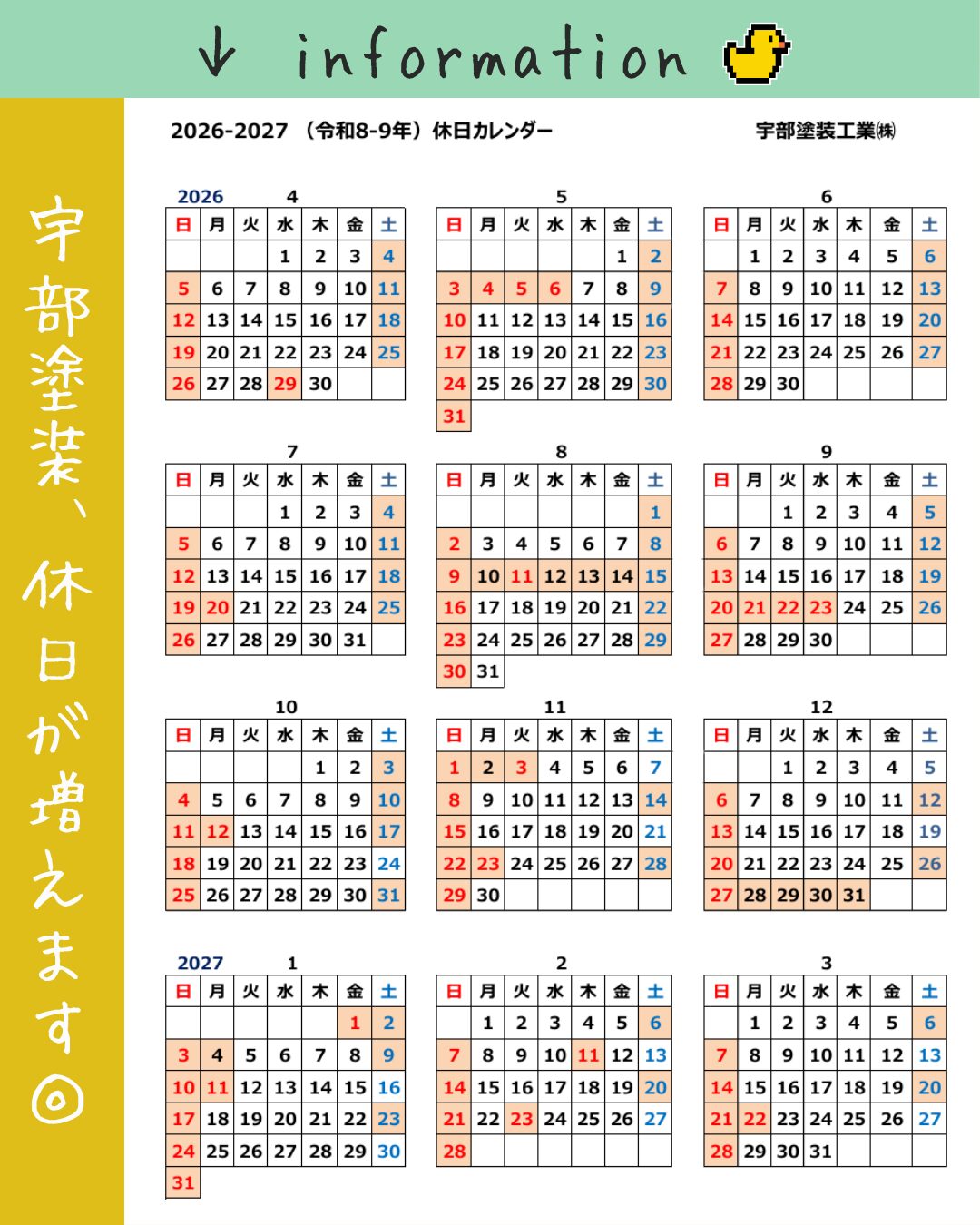 2026年4月から宇部塗装、さらに休日が増え年間120日になります!!