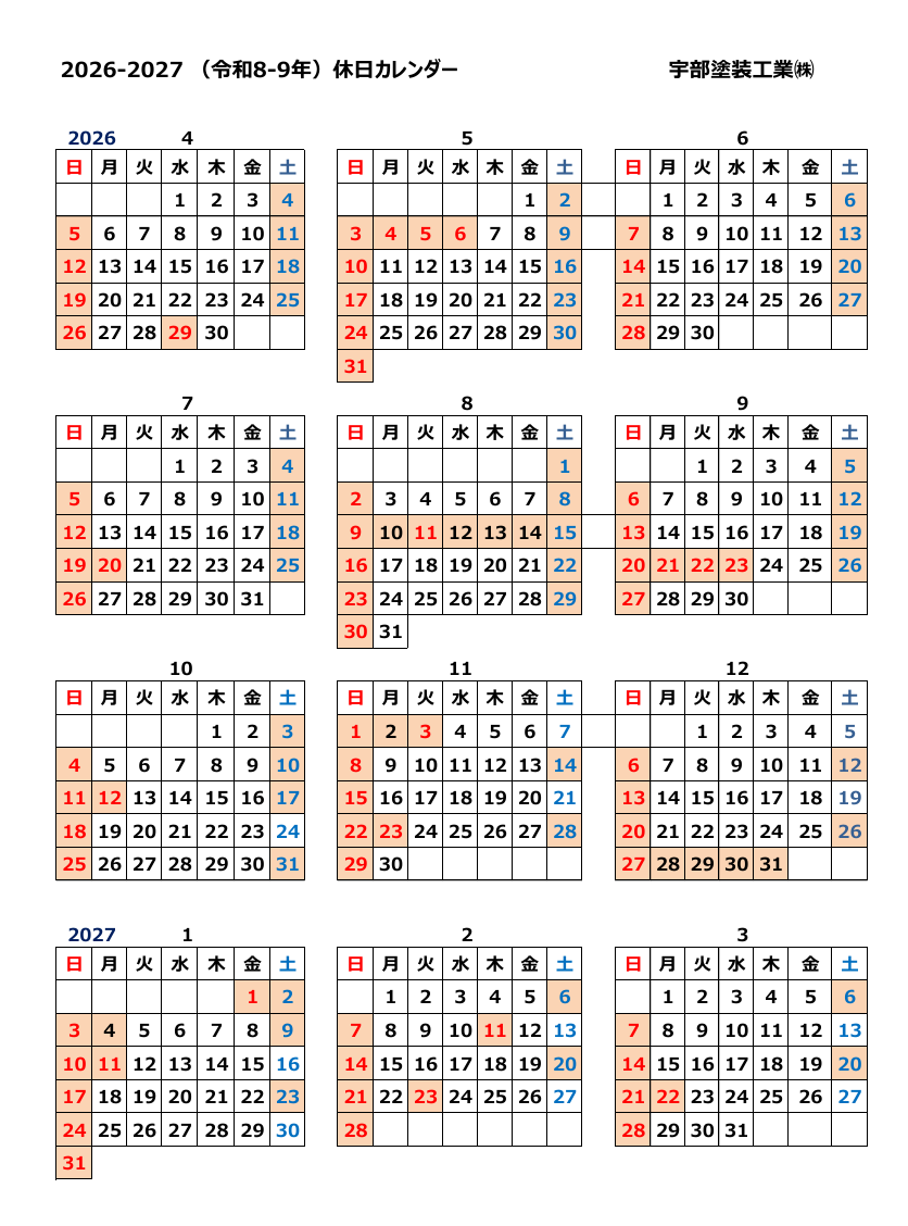 2026.4月~の休日カレンダーができました